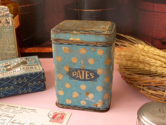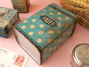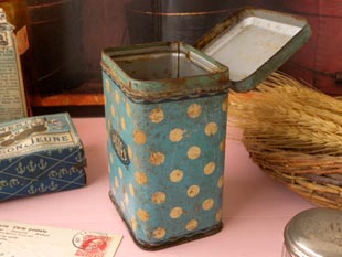 おそらく1930年代にフランスで製造されたティン製のブルー&アイボリーポルカドットパッツ缶です。こ