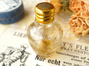 レアなゴールドのメタル製のフタの付いた小さなパフュームボトルで、イエローオーカーにゴールドの文