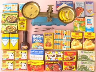 製のブルーのスケールとトングがあり食料品と日用品の厚紙のパッケージが全部で30個あります。また、