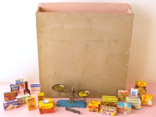 おそらく1940年代にフランスで製造されたトイスケール&パッケージ付きの木製のピンクトイエピスリー