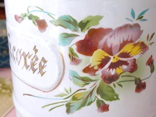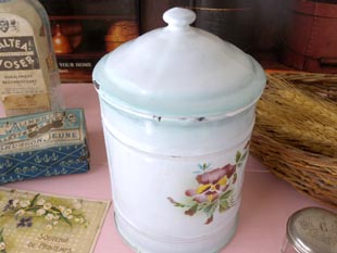 ウ製のペールブルー&ホワイトパープルパンジーチコリーキャニスターです。ジャピーフレール社は1806