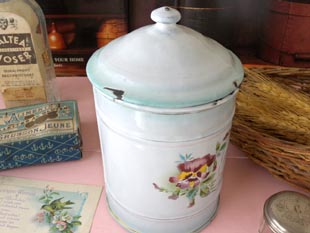 ウ製のペールブルー&ホワイトパープルパンジーカフェキャニスターです。ジャピーフレール社は1806年