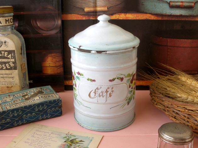 いたキャニスターで、本体にはゴールドのカリグラフィ書体でCafe(コーヒー)のロゴとパープルのパン