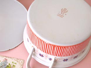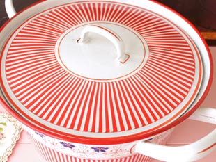 れいなホウロウキャセロールはとてもレアですね。ローズガーランドシリーズのキャニスターやセルボ