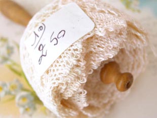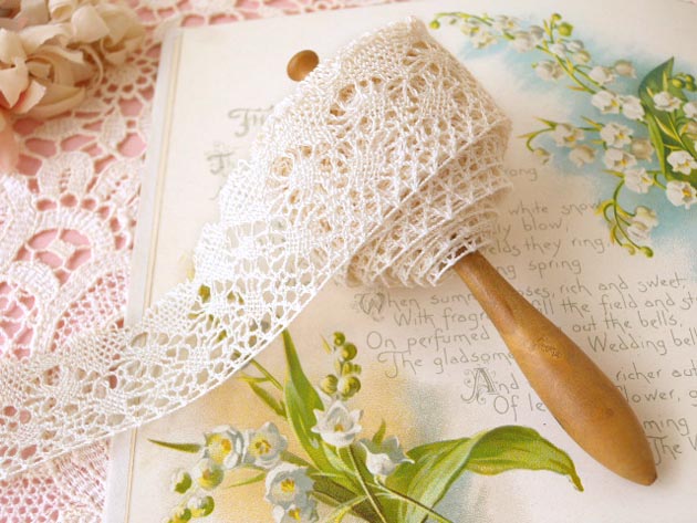 していて飴色になった木肌がいいですね。おそらく手芸店で量り売りされていたレースのようですが、こ