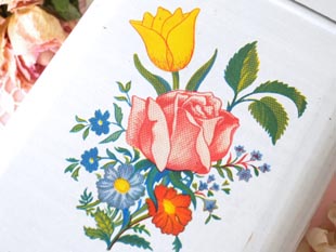 スター缶で、本体はホワイトカラーにピンクローズとイエローチューリップとレッドとブルーのデイジー
