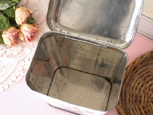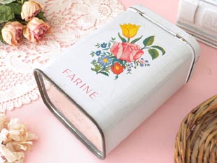 おそらく1960年代にフランスで製造されたティン製のホワイトフローラルファリーヌキャニスター缶です。