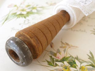 シャレでとてもいい感じです。また、ボビンレース用の木製のボビンが付属していて飴色になった木肌が