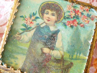 ヌーヴォーデザインの本体のフタには左手にバスケットを抱えてピンクのお花が咲いた小枝を持ったチャ