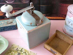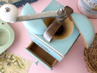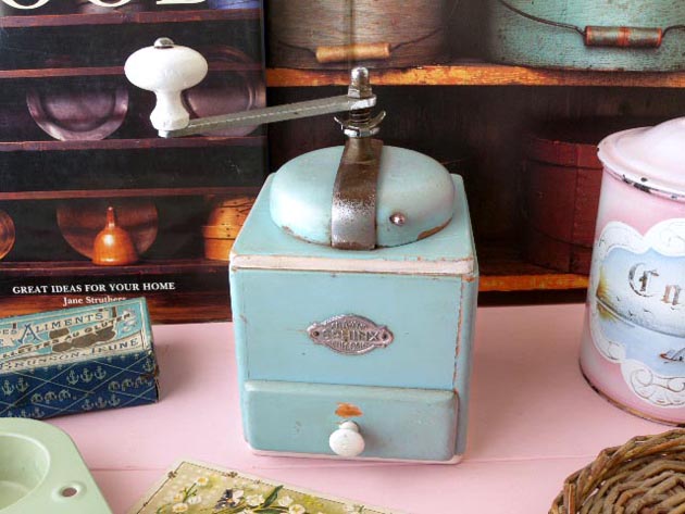 カラーのフェアリーブルーとアイボリーのカフェムーラン(コーヒーミル)で、本体にはFilakovo Sphinx