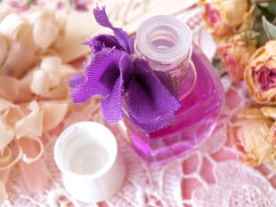 ラスチック製の白いフタにヴィオレットの花のコサージュが付いたガラス製のパルファンフラコンで、本