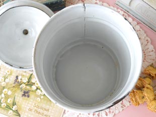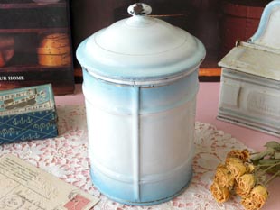 ションにゴールドのトリムの付いたエマイユポット(ホウロウキャニスター)で、本体にはゴールドのカリ