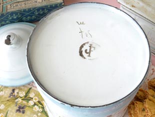 ユ)ホウロウ製のペールブルー&ブランシュポープルパンジーシュクレエマイユポットです。ジャピーフ