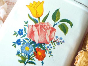 ルージュとブルーのデイジーなどのブーケが描かれていてエレガントでオシャレでとてもいい感じです。