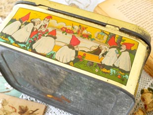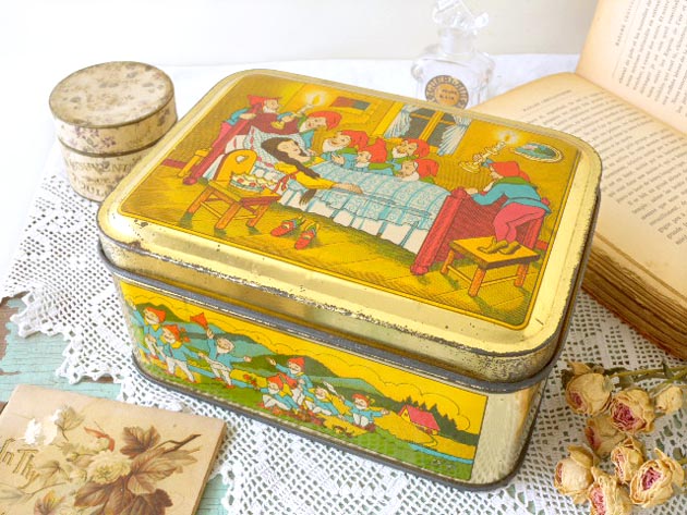 人の小人)の楽しいシーンがデザインされたドール(ゴールド)色のフタがヒンジで開閉するビスキュイボ