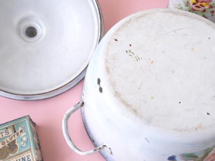 製造時からのものです。多少の汚れなどありますが古いものにしてはホウロウの剥がれやサビは少なく割