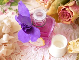 アなプラスチック製の白いフタにヴィオレットの花のコサージュが付いたガラス製のパルファンフラコン