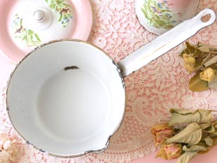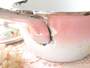 写真のようにホウロウの剥がれや背面のヴィオレットのイラストが薄くなっていますが、フタはホウロウ