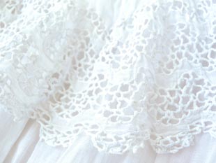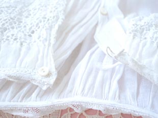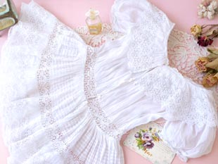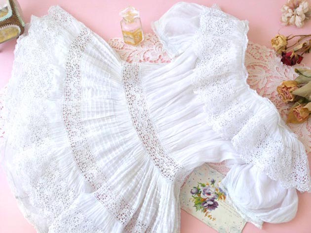 ピンタックがあり襟やウエストや裾にはウェーブパターンのダンテル(レース)が使われていてエレガント