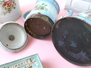 写真のようにフタや本体にホウロウの剥がれやサビがありますがローズの花のイラスト部分には剥がれは