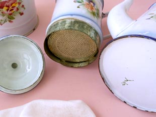ン)の花が描かれていてエレガントでオシャレでとてもいい感じです。上段のポットの底はネルクロスフィ