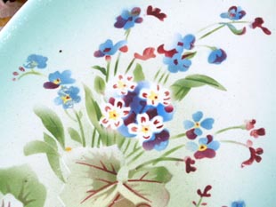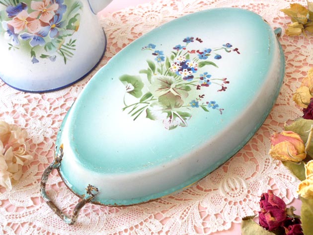 底面のブーケのイラストに擦れはほとんどなくとてもきれいです。多少のホウロウの剥がれやサビや汚れ