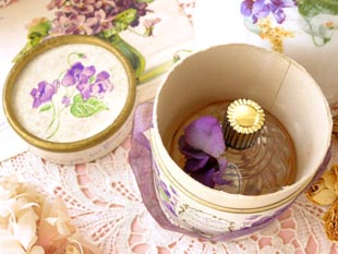 な香水だったようです。こちらはヴァイオレットのリボンが付いた筒型のパルファンボワットに入ったプ