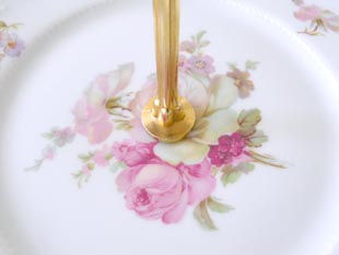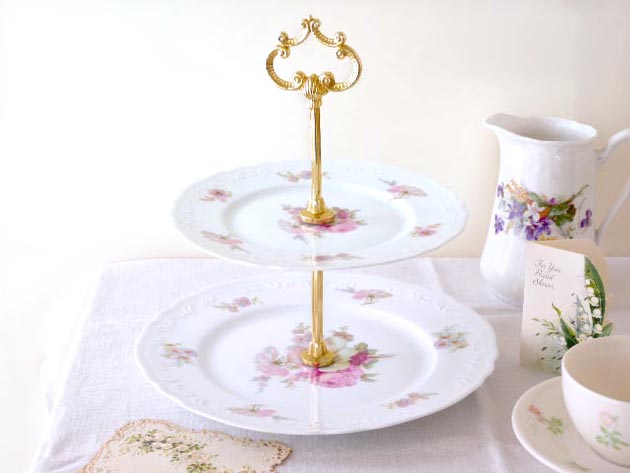 レーヌ(給仕の磁器皿)といわれている二段のケーキスタンドで、ウェーブエッジのディッシュにはアラベス