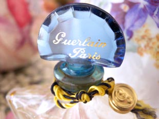 たコキーユ(貝殻)フォルムのフラコン(ボトル)で、ブルーのフタにはゴールドでGuerlain Parisと書かれて