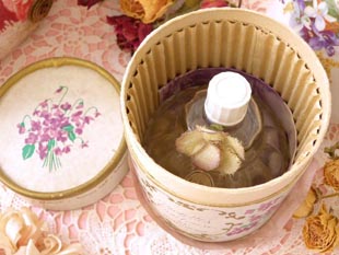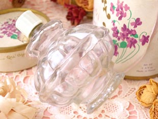 フタの付いたパルファンフラコンで、花びらのような美しいレリーフの本体にはクロス製のヴィオレット