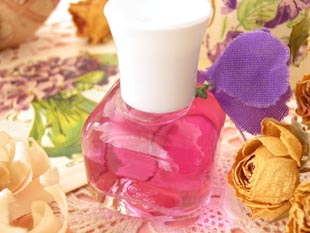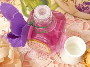 スチック製の白いフタにヴィオレットの花のコサージュが付いたガラス製のパルファンフラコンで、本体