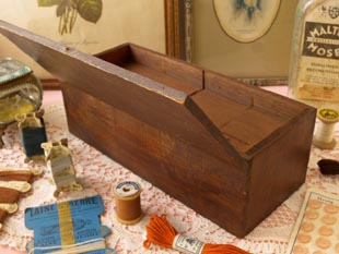 ヒンジで開閉するフタがあり中にはクチュール(ソーイング)の小物などが収納できます。また、本体には
