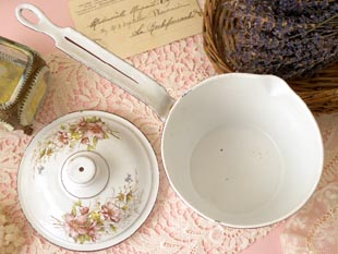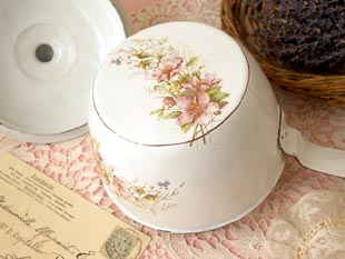 おそらく1930年代にフランスで製造されたエマイユ(ホウロウ)製のフタ付きのロゼローズブランシュエマ