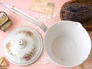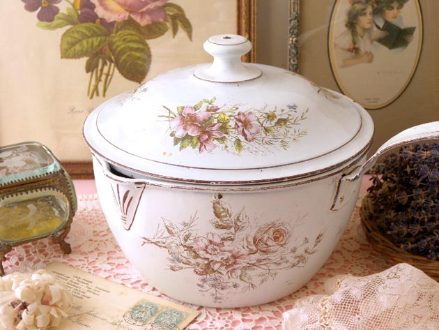 おそらく1930年代にフランスで製造されたエマイユ(ホウロウ)製のフタ付きのロゼ&ブランローズブラン