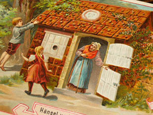 話のHansel and Gretel(ヘンゼルとグレーテル)の楽しいイラストとお話がデザインされたクロモ(トレーディ