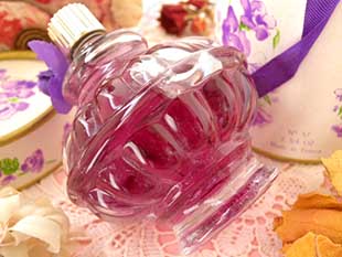 ファンフラコンで、花びらのような美しいレリーフの本体にはクロス製のヴィオレットの花のコサージュが