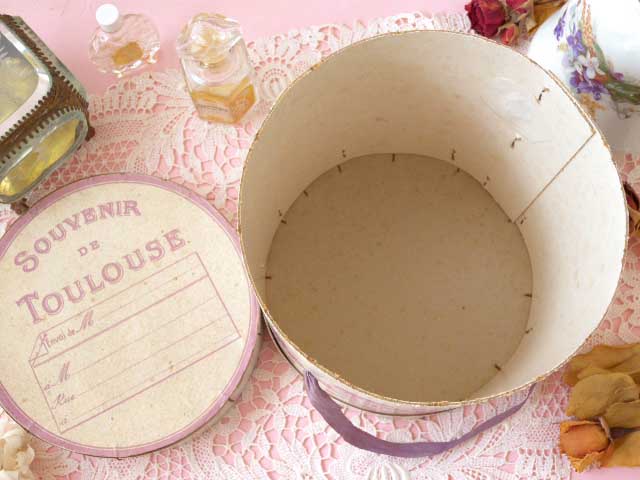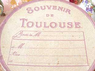 制作された厚紙製のヴァイオレットのリボンが付いた筒型のボワットで、フタにはsouvenir de Toulouse