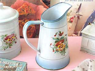 ホウロウ製のブルークレール&ブランシュロゼ&ジョーヌパンセピシェです。ジャピーフレール社はフランス