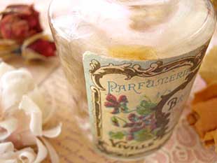 ガラス製のフラコンです。地中海に面した温暖なニースでは昔からローズ、ジスマン(ジャスミン)、ミモザ、