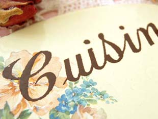 カーシヴ書体でCuisineと書かれています。また、プラックにはハンドプリントされたおそらく ローズとミ