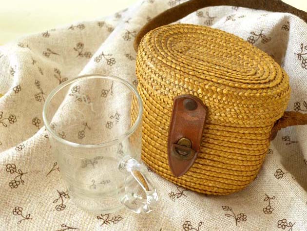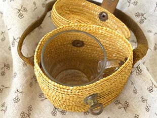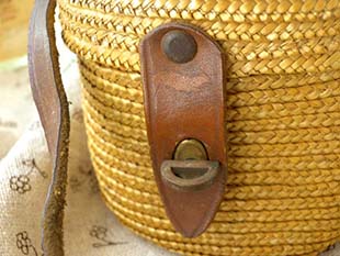 むために作られた革のベルトと留め金の付いた草編みされたフタ付きのパニエ(バスケット)と中に入ったガラ