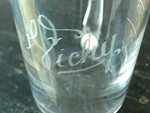 ス製の取っ手の付いたヴェール(グラス)のセットで、白いVichy(ヴィシー)のロゴとヴェールの形に合わせて作