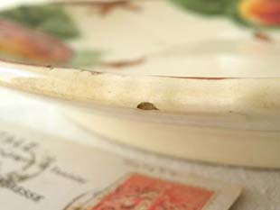 写真のようにフチに古い時代にできた縦2ミリ横3ミリ位の欠けが一箇所あります。また、フチと底面に2ミ