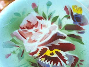 (イエロー)のパンセ(パンジー)のお花がデザインされています。また、底面には美しいロゼのローズとパンセ