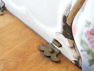 写真のように右側のヒンジの留め金が切れていますが使用にはあまり支障はありません。フタに反りや割れは