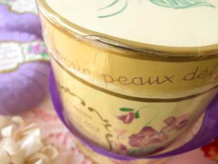 透明なプラスチック製で底面は厚紙製です。ヴァイオレットカラーの紙に包まれたサボンには、ゴールドの