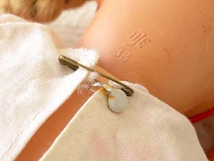 れて欠損しているので寝かせても瞼は完全には閉じません。ずきんとエプロンドレスに破れやほつれはあり