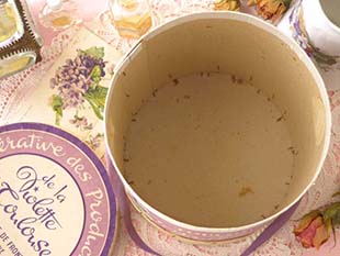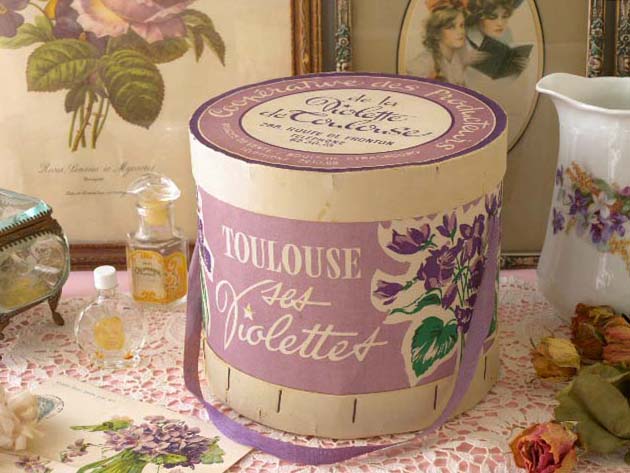 オレットのリボンが付いた筒型のボワットで、フタにはde la Violette de Toulouse 288, Route de Fronton