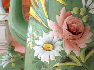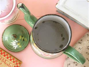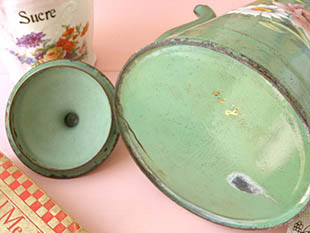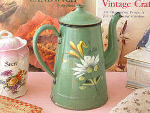 おそらくフランスで1930年代に製造されたホウロウ製のヴェールオリーブロゼローズ&マルグリットカフェ