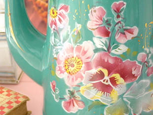 ンセのお花とオシャレなテュルコワーズのカフェティエールは、見ているだけでエレガントで華やいだ気分